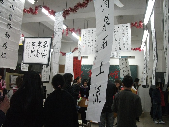 11月26日,冬日的夜晚多少有了些许寒意,但东方红校区文科楼C栋一楼却人头攒动,灯火辉煌,同学们或展纸泼墨、笔走龙蛇,或琵琶快抚、古筝轻挑,或留恋灯谜、凝神解悟……好一派热闹非凡、暖意融融的景象,这是我院文史系为学院第26届校园文化艺术节的深入推进而正在开展的“文化长廊行”活动。