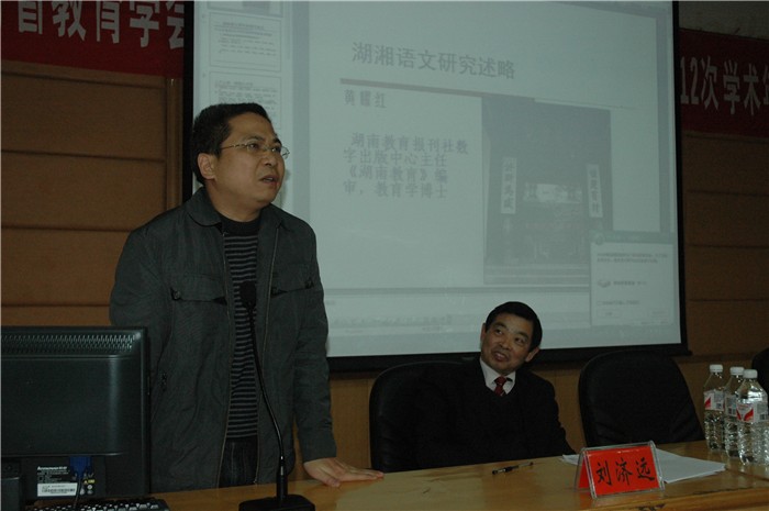 开幕式结束后,与会的代表、专家们开始了热烈的学术研讨。我院的刘济远教授、湖南师范大学的张良田教授、湖南科技大学的李学博士、湖南教育报刊社数字出版中心主任黄耀红博士、湖南师范大学程大琥教授分别作了题为《重整旗鼓、再铸辉煌——由湖湘语文教育所想到的》、《中国古代母语教育的四大法宝及其现代启示》、《湖南语文教育发展史关键词分析》、《湖湘语文研究述略》、《湖湘语文要特别关注的四个字》的学术报告,报告内容丰富,深入浅出,不时赢得代表专家的阵阵掌声。