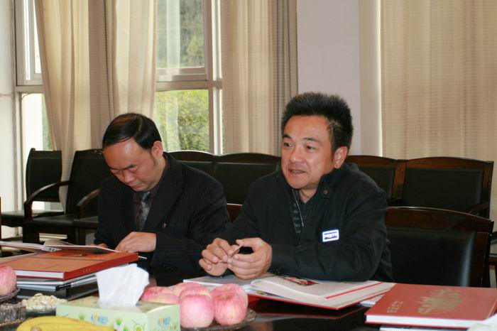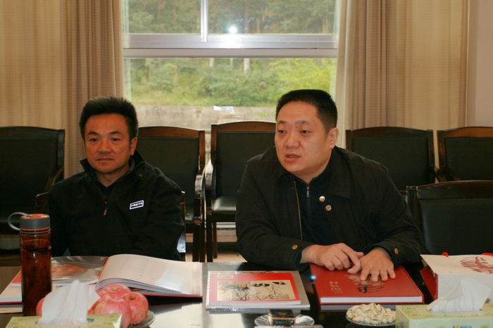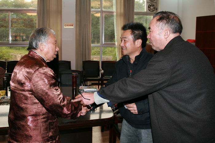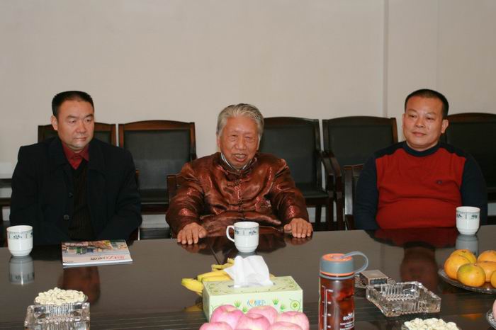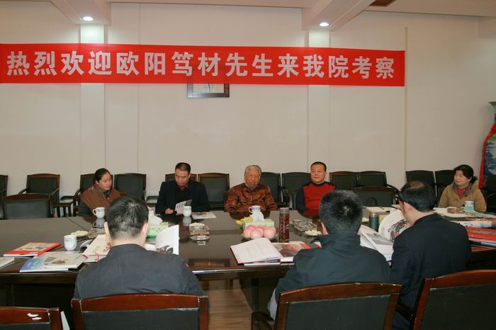 詹小平书记全面介绍了我院的基本情况,对欧老的艺术作品给予了高度评价,并诚挚邀请欧老加盟我院。肖湘愚副书记、刘鸿翔副院长从“名校名家、相得益彰”的角度阐述了欧老将书画捐赠我院的种种益处。九十高龄的欧阳笃材先生听完我院的情况介绍后,简要叙述了自己的生平经历,由衷表达了对毛主席母校的热爱和敬意,并表达了把书画捐赠给一师的心愿。余岁柏董事长转达了欧老捐赠书画的主要意见。