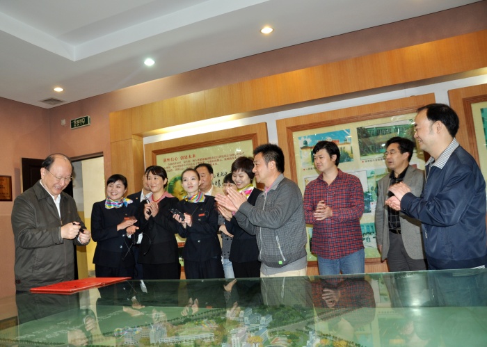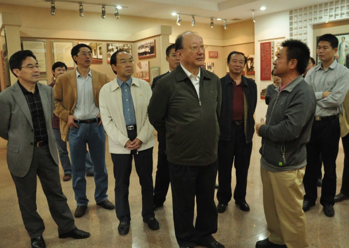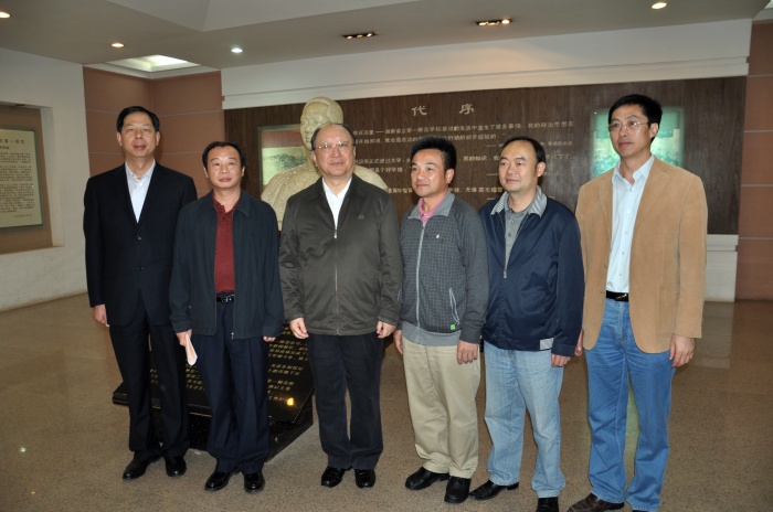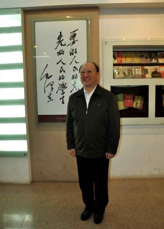 徐院士参观到第一展厅,在青年毛泽东塑像前与院领导合影留念,之后他特别提出要在毛泽东给我校题写的“要做人民的先生,先做人民的学生”的题词前留影。他深情地告诉大家:“我也做过28年老师。”这充分表明了作为一名人民教师的他对主席教诲的深刻领悟,也深深表达了他对主席的崇敬之情。