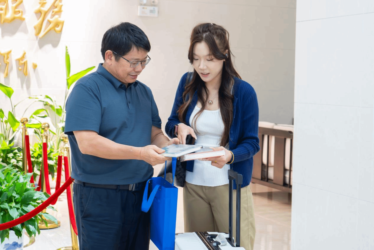 来自湖南湘潭的教育专业新生周丹仪是今年首位报到的研究生。罗成翼代表全体师生向周丹仪表示热烈欢迎,并为她佩戴校徽、赠送校史书籍。