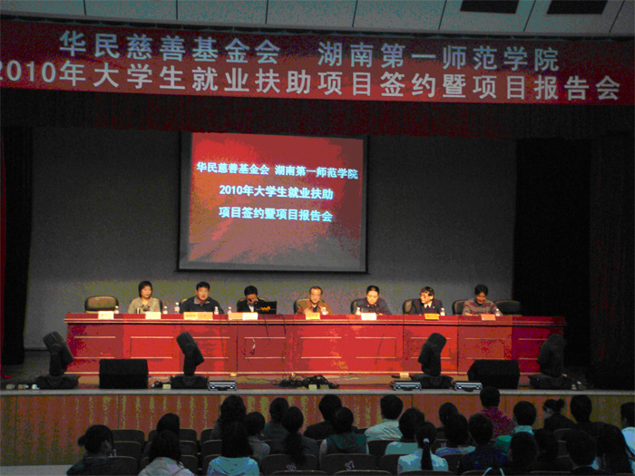 4月10日上午10点,87978797威尼斯与华民慈善基金会就2010年大学生就业扶助项目在我院东方红校区科技楼演播厅举行项目合作协议签字暨“资本精神与现代慈善事业”报告会。签字仪式及报告会由我院李学全副院长主持。院领导彭小奇、肖湘愚,学生工作处何文处长、杨虎智副处长以及各系部党总支(支部)副书记、学工办主任、辅导员、学生代表出席会议。