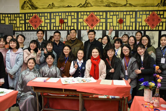本次艺术展共设六个展馆。“畅音阁”的舞台上,几位学生京剧爱好者正在登台唱戏;“国学草堂”通过国学经典诵读、小型传统故事情景剧等将国学文化融入活动中;“清雅阁”呈现了唐诗宋词文化、蹴鞠文化、舞曲技艺等;“临巷知湘”展馆以传统风格的老街为背景,展示湖湘饮食文化;“文渊阁”为藏书之地,展馆汇集了笔精墨妙的书法作品、破画欲来的绘画作品,是文传院师范生扎实基本功的一个缩影;“文风蔼蔼”主要展出学院网媒、广电专业学生学习成果,让观众在试听盛宴中感受新媒体与传统文化的融合。