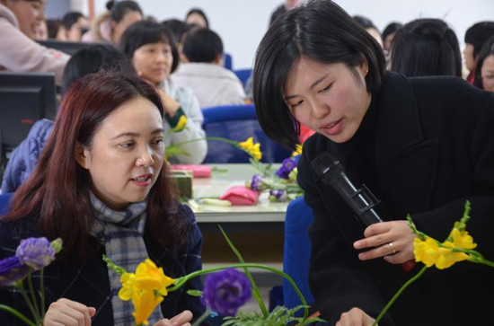 3月8日下午,美术与设计学院吕紫薇老师为女教职工带来了花道讲座,湖南省教育工会女工主任孙晓红应邀来校与我校女教职工一起分享学习了花艺的快乐。吕老师以“中华花艺.筒花”为题,详细地介绍了插花的方法、步骤,指导老师们现场插花,并与孙主任一道评选出优秀习作一、二等奖。