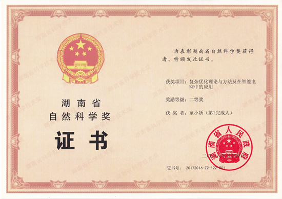 5月4日下午,湖南省科技创新奖励大会在长沙召开。211个项目分获2017年度省自然科学奖、省技术发明奖和省科技进步奖。我校童小娇教授团队申报的“复杂优化理论与方法及在智能电网中的应用”荣获湖南省自然科学奖二等奖,这是我校首次以第一单位、第一申报人在湖南省科学技术奖中获得的最高奖项,实现了我校省科学技术奖零的突破。