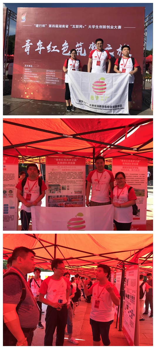 为全面贯彻习近平新时代中国特色社会主义思想和党的十九大精神,深入落实习近平总书记给第三届中国“互联网+”大学生创新创业大赛“青年红色筑梦之旅”大学生重要回信精神, 2018年6月26日,“建行杯”第四届湖南省“互联网+”大学生创新创业大赛“青年红色筑梦之旅”活动启动仪式在湘潭韶山市毛泽东广场举行。教育部高教司二级巡视员吴爱华,湖南省教育厅党组成员、副厅长、省委教育工委委员葛建中,湘潭市人民政府副市长刘永珍等地方政府代表出席仪式。来自全省80余所高校、130余个项目参与启动仪式。我校致力于公益创新教育的“造梦工厂“团队代表我校在活动仪式上进行展示并与湘潭市的四十个村进行扶贫项目帮扶对接。
