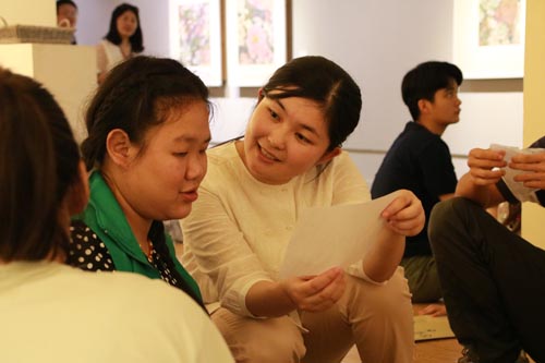 教育部艺术学科专家罗炜(左三)、国家心理咨询师罗波夫(左四)在画展现场与家长交流“生命的不可思议——从蔡皋画里品味家长成长”