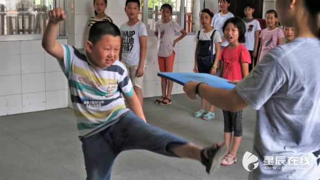 (跆拳道课上学生展示前踢动作。 段钰琦 摄)