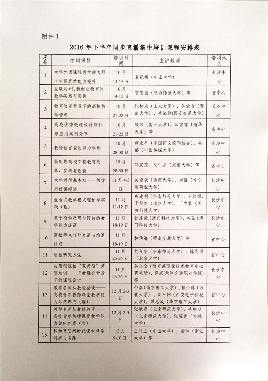 根据《关于资助高校教师参加网络培训的通知》(湘高培函〔20162号)和《关于资助高校教师参加网络培训的补充通知》要求,现将我校2016年下半年教育部全国高校教师网络培训工作安排通知如下:
