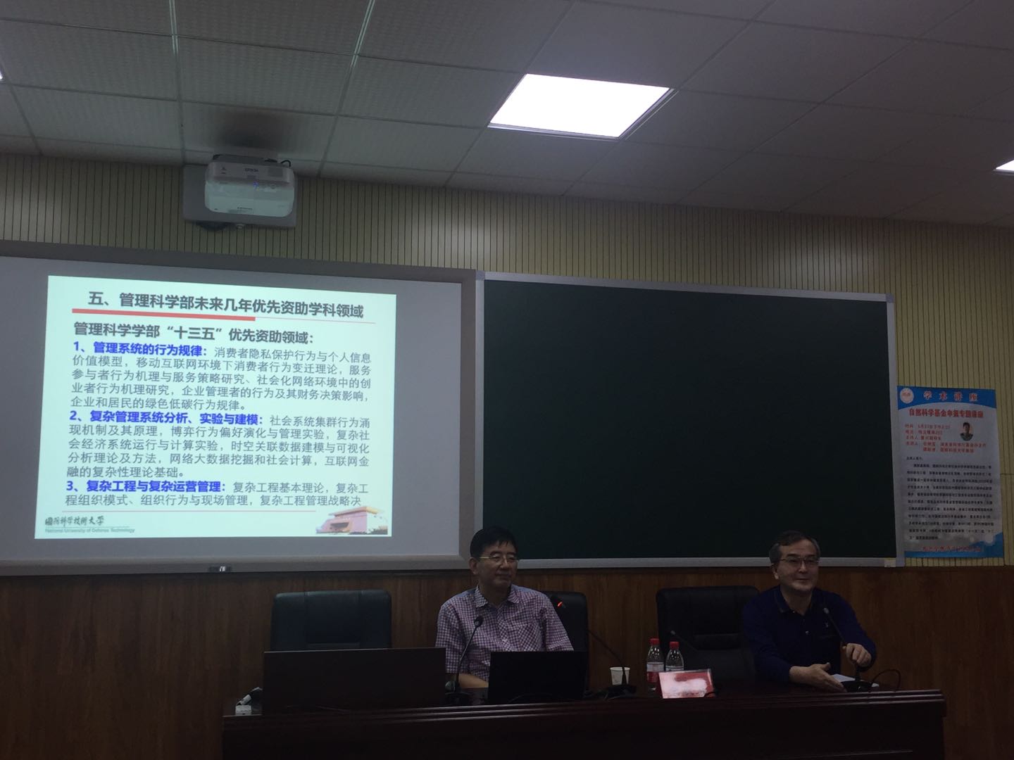谭跃进教授的报告题为怎么申请国自科学基金项目——以管理和信息学科为例,报告内容主要分为三个部分:第一部分介绍了国自科学基金项目的评审要求和发展趋势,重点分析了探索、前沿、需求、交叉四个方面的内容。第二部分从数据上分析了2015~2018年国自申请和立项情况,着重强调了大数据在管理科学领域的发展与应用。第三部分结合具体申请案例,详细分析了国家自科基金申请中的常见问题和应注意的事项。在提问环节中,谭跃进教授与参加讲座的教师们就申报注意事项等问题进行了深入交流。