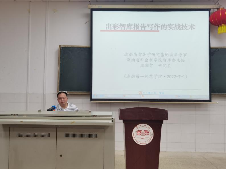 7月1日下午两点半,湖南省社会科学院智库办主任、文献信息中心主任、湖南省智库学研究基地首席专家周湘智研究员来商学院玉衡楼南栋604作题为《出彩智库报告写作实战技术》讲座。曹兴副校长、商学院肖攀院长、荆龙姣副院长、汤礼莎副院长、李辉华副书记及教师代表出席会议。会议由曹兴副校长主持。