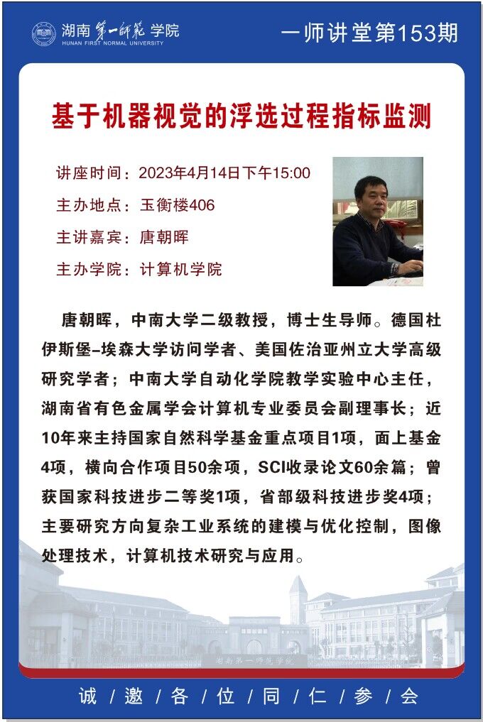 学术预告|一师讲堂第153期:基于机器视觉的浮选过程指标监测
