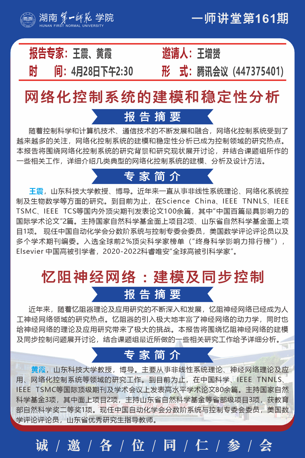 学术预告|一师讲堂第161期:网络化控制系统的建模和稳定性分析;忆阻神经网络:建模及同步控制