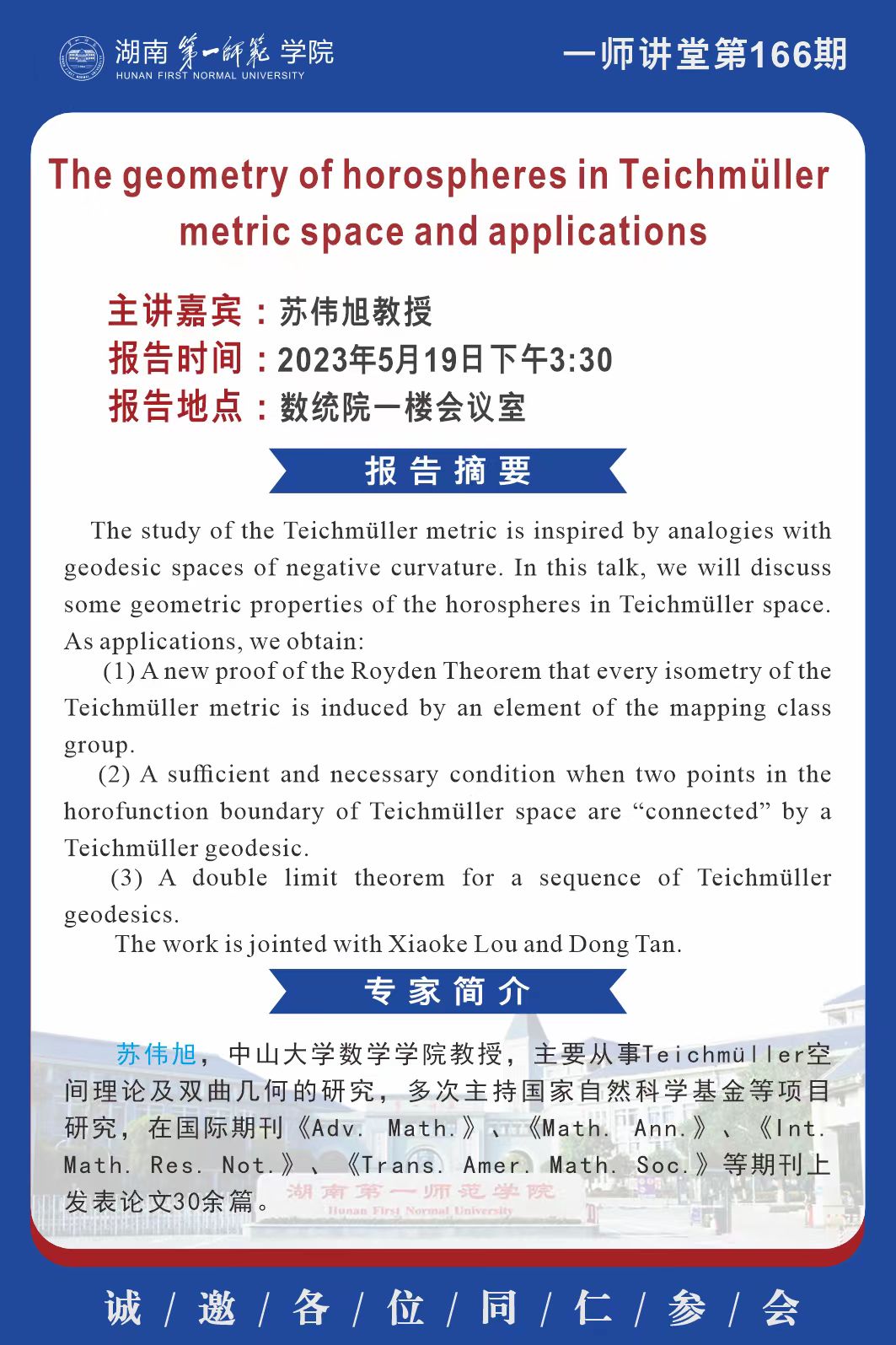 学术预告|一师讲堂第166期:The geometry of horospheres in Teichmuller metric space and applications