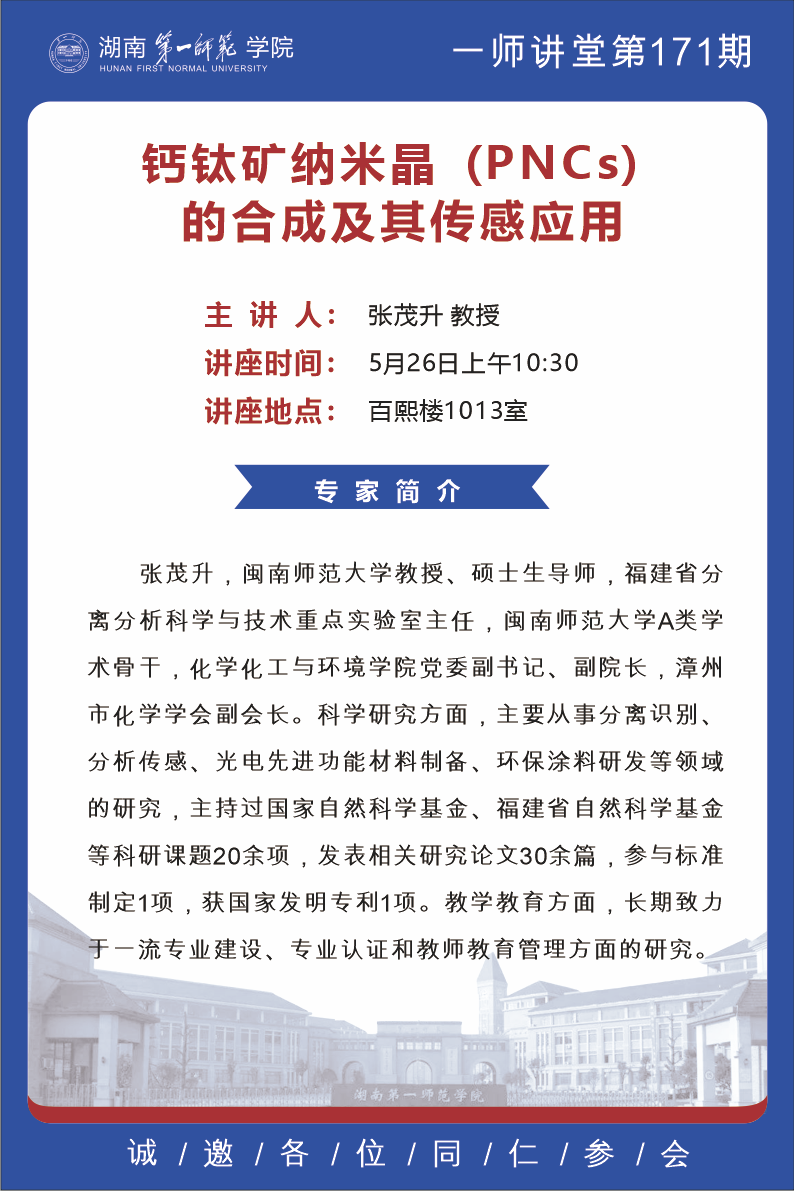 学术预告|一师讲堂第171期:钙钛矿纳米晶(PNCs)的合成及其传感应用