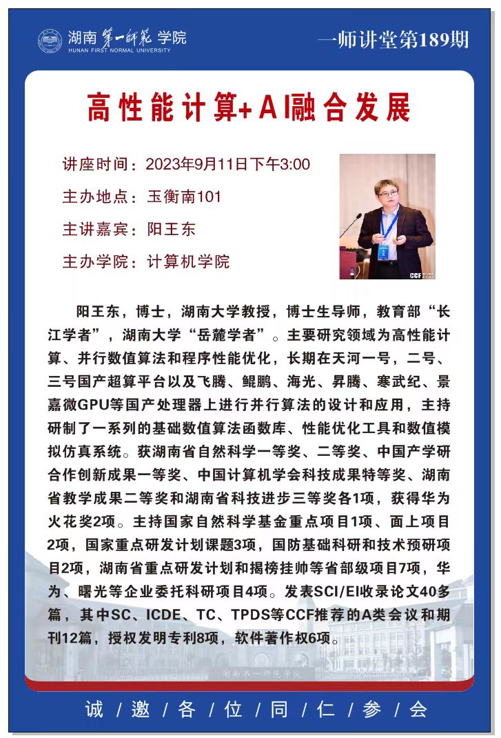 学术预告|一师讲堂第189期:高性能计算+AI融合发展