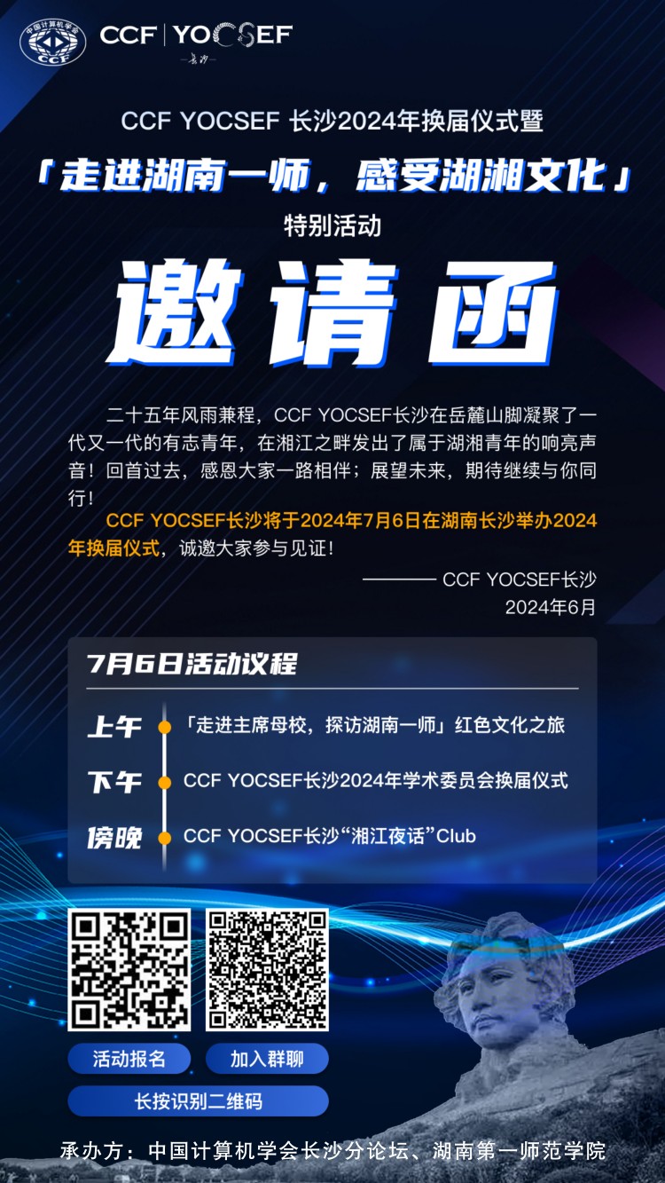 学术预告|学术会议:CCF YOCSEF长沙2024年换届仪式暨“走进湖南一师,感受湖湘文化”特别活动