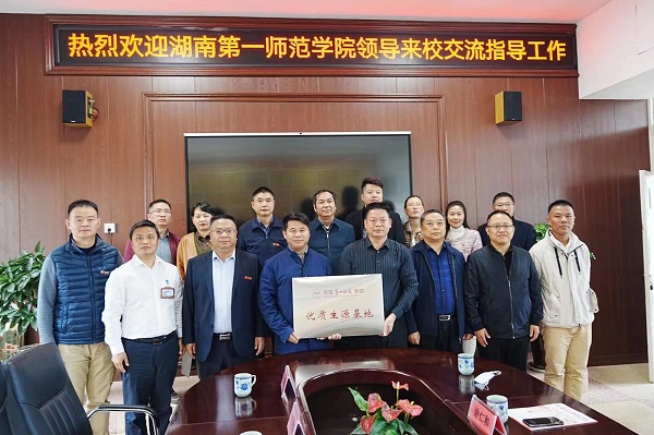 安化县江英实验学校校长谢仁河对周发明一行的到来表示热烈欢迎,并对我校近年来向该校输送数十名优秀毕业生表示感谢。周发明简要介绍了一师的办学历史、办学成就,着重介绍了学校在“十四五”时期的发展思路、办学定位,并代表学校为安化县江英实验学校授予“优质生源基地”牌匾。