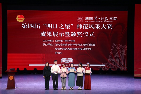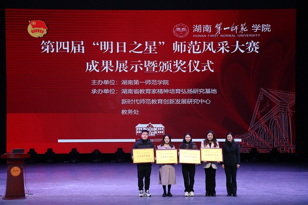 12月10日,我校第四届“明日之星”师范风采大赛成果展暨颁奖仪式在东方红校区田汉剧场举行。校党委委员、副校长蒋蓉出席活动并讲话。学生工作部、教务处、校团委负责人,各二级学院党委副书记、分团委书记及指导老师、学生代表参加活动。此次活动采用线下观看、线上同步直播的形式,观看人数累计4000余人。